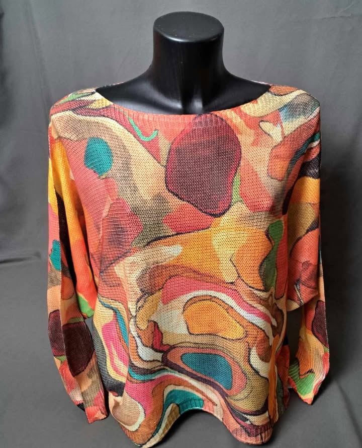 Majica s prelivom različnih motivov in barvami. Primerna za razne priložnosti in za tiste , ki imajo rade umetnost. Slika je na obeh straneh. Rokavi so krajši.