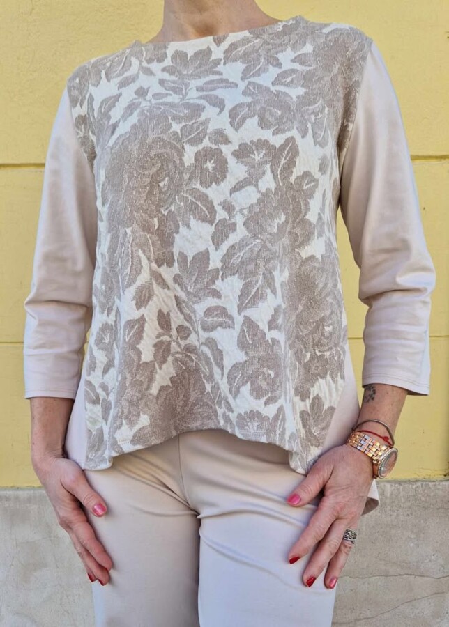Ženska maja z čudovito vezenino in 3/4 rokavi . V nežni pastelni bež barvi, vezenina spredaj pa v odtenku temnejše bež. V enotni velikosti – širši, udoben model in ustreza od S do XL . Material : 95% bombaž in 5% elastan .