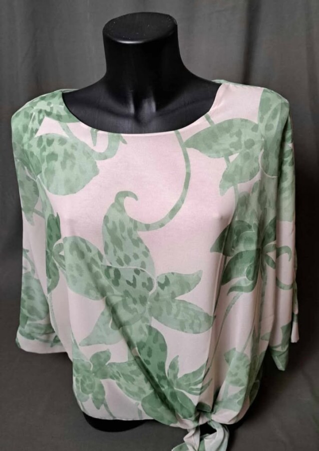 Ženska til maja, ki ima viskozno podlogo in prosojne rokave . Spodnji del krasi trak, ki se zaveže v pentljo. Maja ima okrogel izrez in se lahko kombinira za več priložnosti .